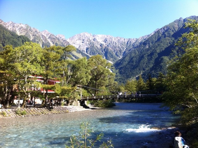 河童橋手前からみる穂高連邦がとても美しく見えます。梓川もエメラルドのような輝きでとても美しいです。先週来た時は時間が早かったせいか、ここまで美しい写真にはなりませんでした。