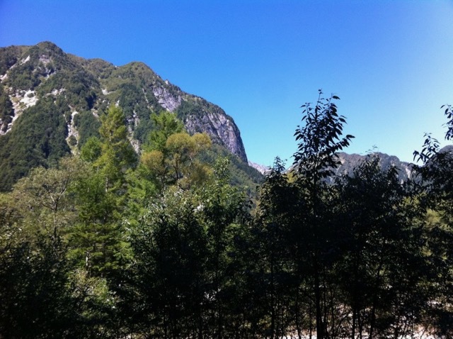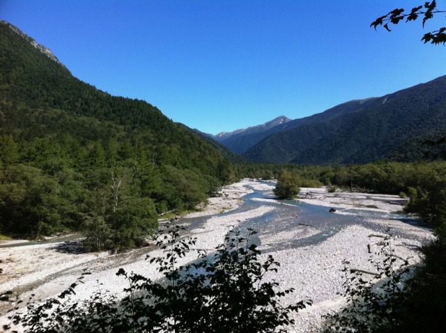 梓川の右側には先週登った蝶ヶ岳の稜線が見えています。そう、まだ「先週」なんですよね。記念すべき北アルプス&テントデビュー。