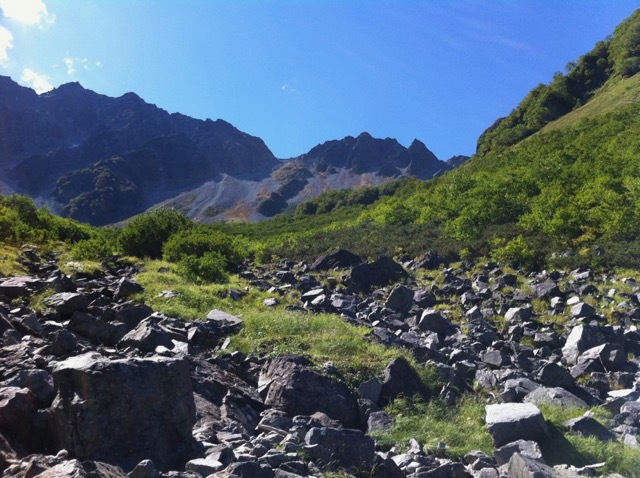 本谷橋から先は本格的な登りになります。結局、横尾から本谷橋は単なる前哨戦に過ぎなかったわけです。徐々にペースが落ちて行き、小休憩を挟んだり、さすがに名だたる穂高連邦の登山道だと実感します。そう簡単には登らせてくれないですね。