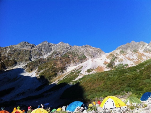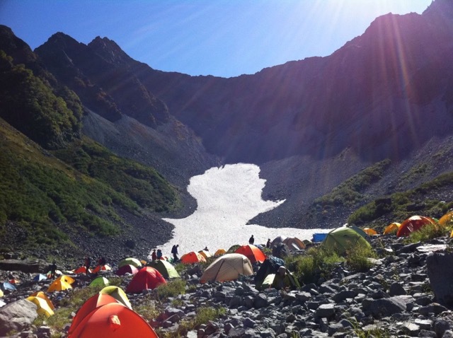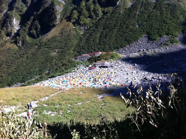 話には聞いてきましたが、穂高連邦にこんな広大なキャンプ地があるというのが驚きです。周囲を穂高の峰々に囲まれてなんだか不思議な場所です。
