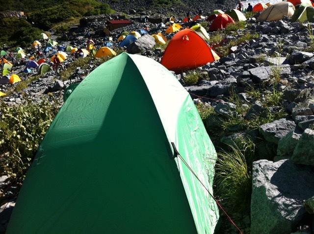 万年雪があんなに沢山残っているのにびっくりです。先週の蝶ヶ岳のテント場に比べてテントの数に圧倒されます。
