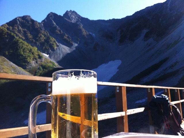 これが最高! 2300mの涸沢で飲む生ビールは格別です。景色だけでも十分なおつまみになります。