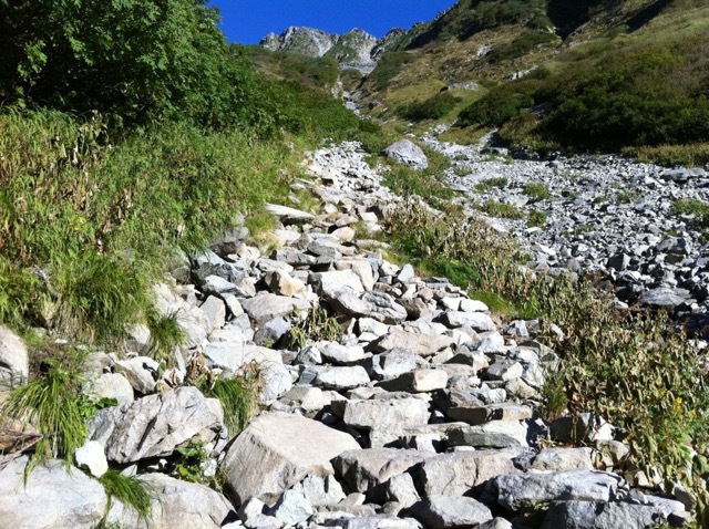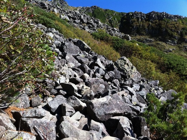 ガレ場です。こんな大きな岩を乗り越えて登っていくなんて経験したことがないので大変興味深いのですが疲れます。よく見ると登山者が歩いた跡がわかります。もちろん平らな岩だけでなく岩の角にバランス取りながら足を置いて行かなければなりません。