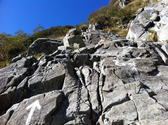クサリの登り方を思い出します。「両手でクサリを持つと不安定になり左右に振られるので、必ず片方の手はクサリ、反対の手は岩をホールドして安定した状態で3点確保で上り下りすること」