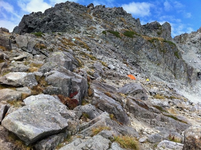 昨日、テントから見上げていると北穂高岳から降りてくる人が確認できたので「ああ、あそこを登っていくんだな」と何となくコースのイメージがついています。