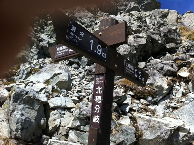 下山する時、異様にテンションが高いお姉さんのグループがこの分岐を見逃して涸沢方面に行こうとしていました。迷っていたので「分岐通り越しちゃってますよ」と教えて差し上げます。どこまで行くのか聞くと「奥穂〜〜♡」と元気よく分岐から奥穂めがけて歩いて行きました。