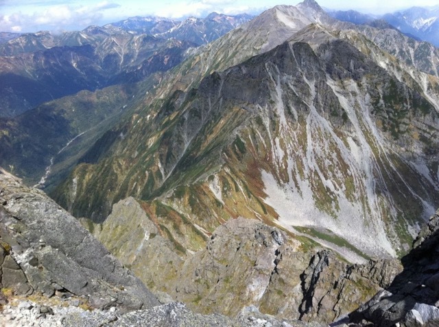 槍ヶ岳からずっと続く稜線。そして北穂高岳にかけて急激にえぐれている登山道、これはもしやあの有名な大キレットではないですか! これは本当に人が歩けるのだろうか? すごいです。