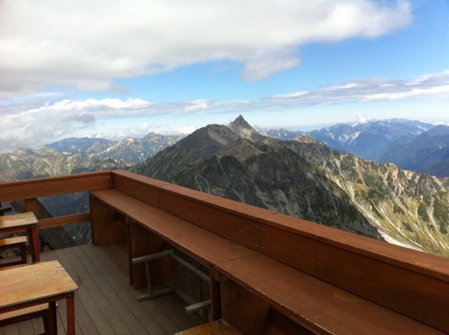 有名な北穂高小屋のテラスです。今日は槍ヶ岳がよく見えています。日本一高い場所にあるテラスでカレーと食後にコーヒーを頂きます。