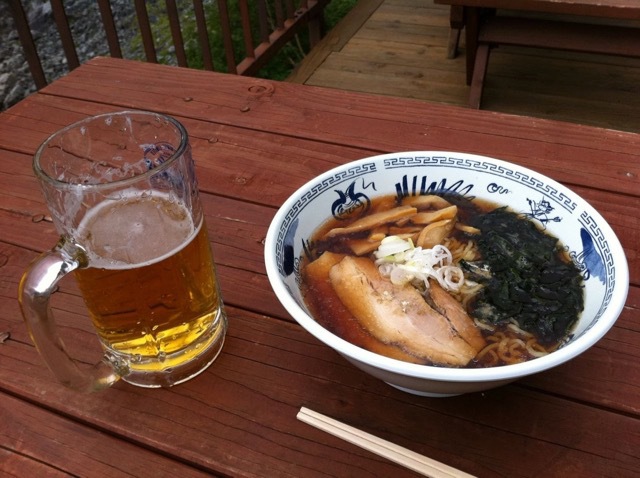 涸沢小屋で登頂祝いをします。写真撮る前にビールをカーッとやってしまいました。ま、いいか。