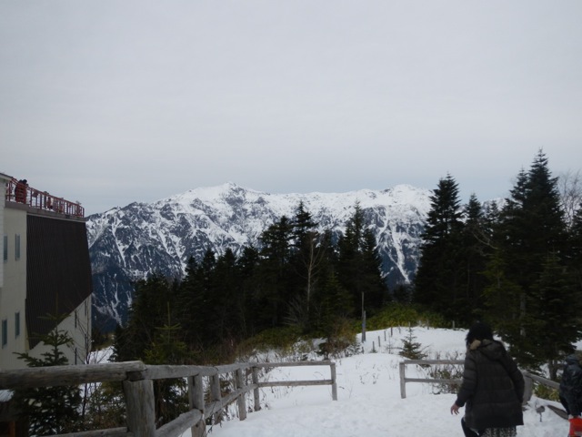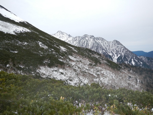 笠ヶ岳方面の冠雪した姿が目に飛び込んできました。かなり士気が上がります。本格的なシーズンになればもっと雪が深くなるのでしょうが、この状態でも十分見応えがあります。