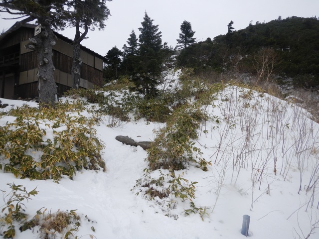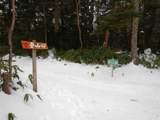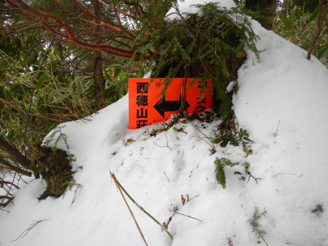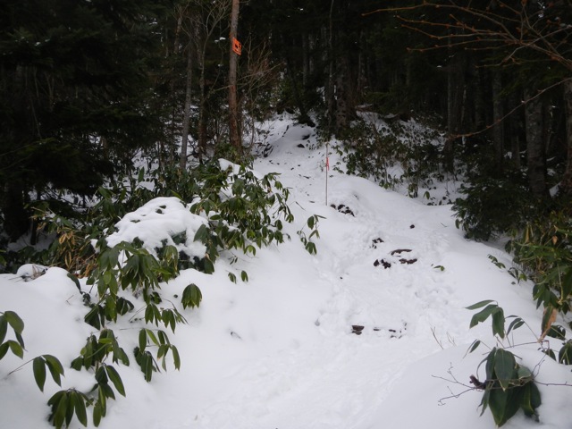 こういう標識が出てくると、今自分は正しいコースを歩いているんだという安心感が持てます。ま、今回は誰がみてもはっきりと分かるトレースがばっちり付いていたので、コースから外れる方が難しいくらいだったんですが、積雪の後、自分が初めて歩くというような状況の場合は、このような標識や、木に巻いた赤いテープなどは頼もしい存在です。