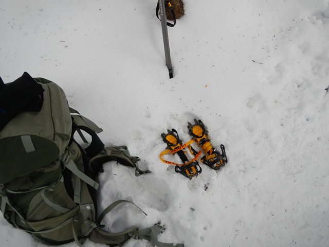 ここに来て、起伏が出始めたのでアイゼンを装備します。また、予想通り暑くなってきたのでミドルレイヤーを脱ぎます。ベースレイヤーの上にハードシェルの状態になりますが、動いている限りは全く寒くまりません。