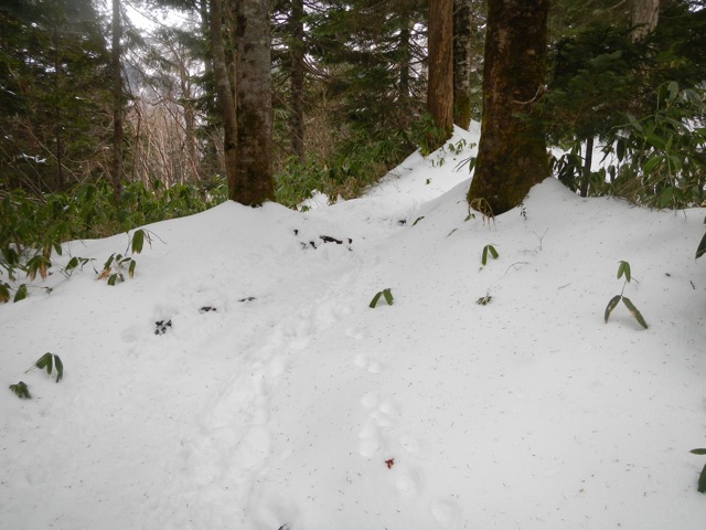 慣れている方はアイゼンなしで歩いているようですが(足跡でアイゼンをつけているかつけていないかはっきり分かります)、無理をせずにアイゼンの刃を雪にめり込ませながら、一歩一歩確実に踏み込んでいきます。