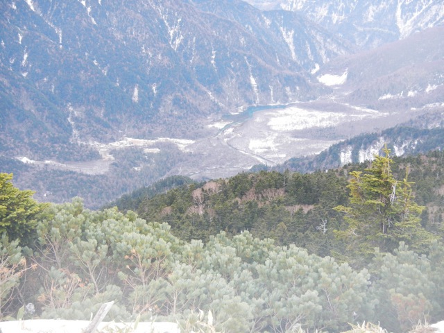 しばらく登って上高地方面を見ると、大正池が見えました。すでに上高地は冬期閉鎖中で静まり返っています。さらに進むと帝国ホテルや河童橋なども見ることができました。