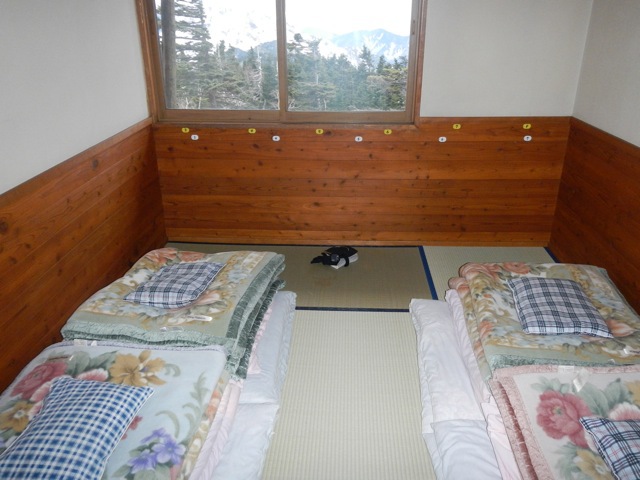 さて、西穂山荘まで戻ってきて受付を済ませます。今日は人数の関係で個室状態です。