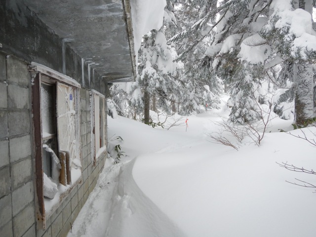 本来はもっと右の方に道があるのですが、雪で完全に埋まっていて、すこしでも雪が少ない避難小屋の壁際を歩いて行っている様子がうかがえます。