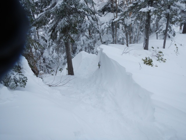 実は、わたしの先を同じくワカンなしで進んでいた方がおり、その方が残していたトレースだったんです。従ってその方から先は大雪が降ってからだれも通った事のない新雪をラッセルしながら進まなければならないという現実に突きつけられたのです。