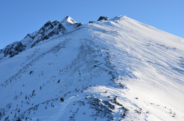 次に峰の頂上付近は夏ルートと冬ルートが分かれます。夏ルートは巻いていくルートになっていますが積雪期は峰の上を越えていけますので巻きません。下山する時間違えやすいので注意が必要です。積雪期に夏ルートを歩くとかなり大変です。