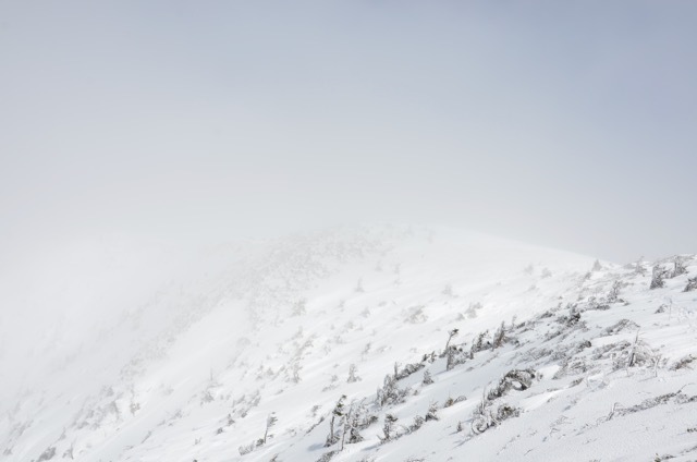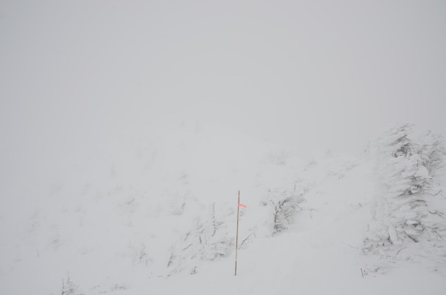 この写真を撮影した時は大変好天に恵まれ、理想的な冬山の姿となりました。誰もがこのような美しい光景を期待するのもでしょう。気象条件によって登山日を調整できる方であればこのような好天に恵まれる可能性も高いでしょうが、なかなかそうもいかないのが現実ではないでしょうか。では実際に天候が崩れるとどのようになるのでしょうか。どうぞ次の写真をご覧ください。