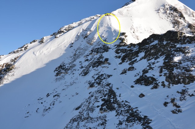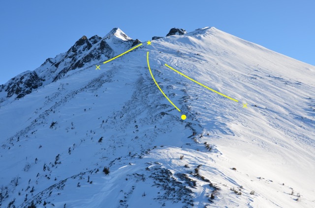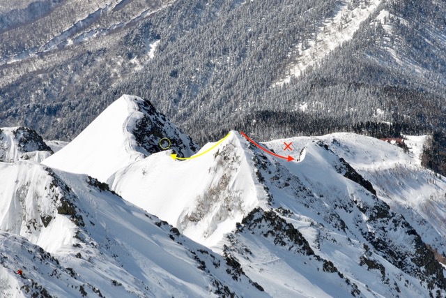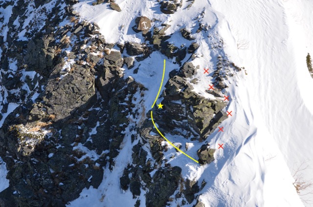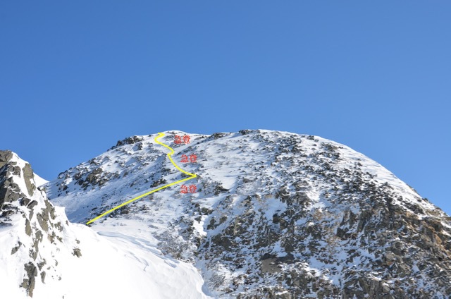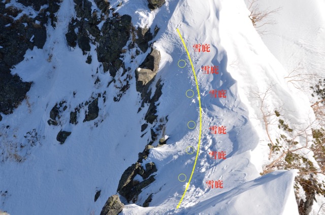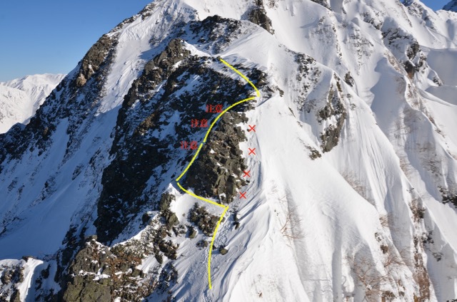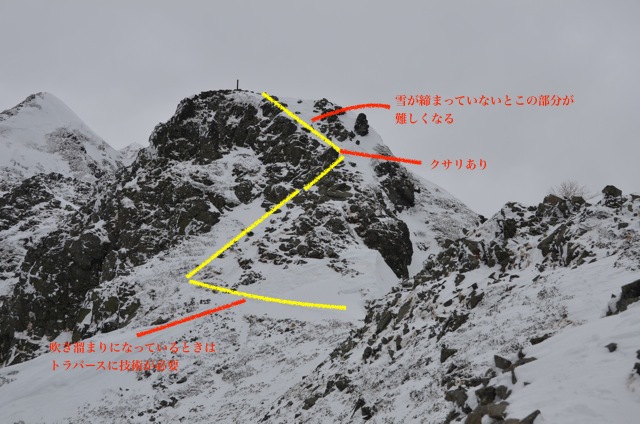 写真にも記入しましたが、この左にトラバースする部分は吹き溜まりになることが多く、この場合は入念にキックステップで蹴り込んで足場を安定させながら進まないとズルズル崩れてしまいます。その後右に切り返して登る部分は比較的安定していることが多いです。