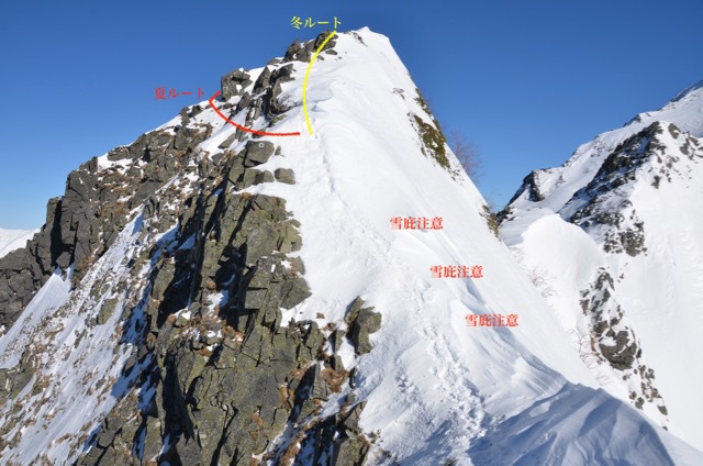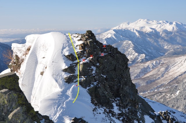 大まかですが写真の黄色い線から右側は雪庇ですので雪の下には何もありません。この部分はもともと痩せ尾根なので本来なら幅が非常に狭い危険な箇所です。写真左側の急斜面は谷底まで続いていますので、ついつい怖くて右側の雪庇の上を歩きたくなってしまうのですが、ここは我慢して本来の尾根の部分を歩くように心がけるべきです。写真右側は雪がなければ数百メートルの崖になっています。