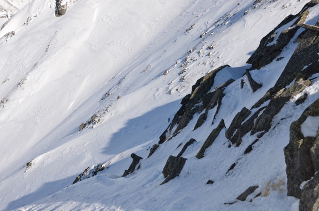 写真は第3峰から先のトラバース部分ですが、左手に続く急斜面は谷底まで続いています。条件が良い時はアイゼンがきちんと効くので慎重にトラバースしていけるのですが、降雪直後等で雪が締まっていないと容易に雪が崩れてしまいパニックになります。体制を崩して滑落を止められず加速がついてしまったら、もう止まる手段がありません。