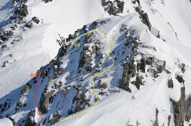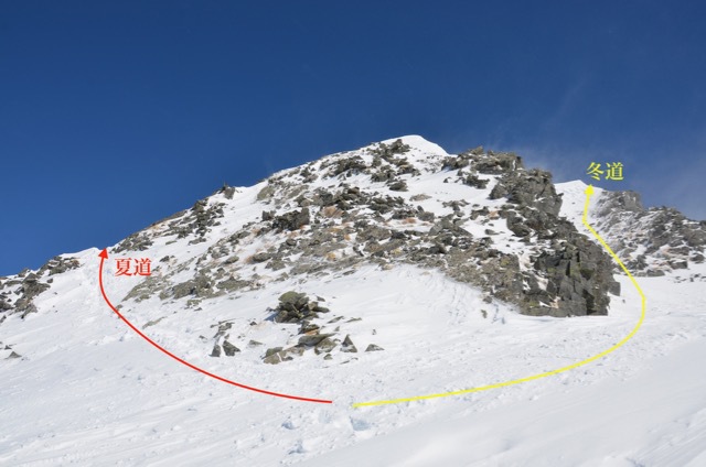第2峰をトラバースした後は夏道と冬道に分かれます。通常なら右側の冬道を辿ります。雪壁を登ることになりますが、冬道の方が上りやすいです。時々、夏道にトレースがついていることもあります。この時期の夏道は短い距離ですが一部緊張感の伴うトラバースがありますので注意します。