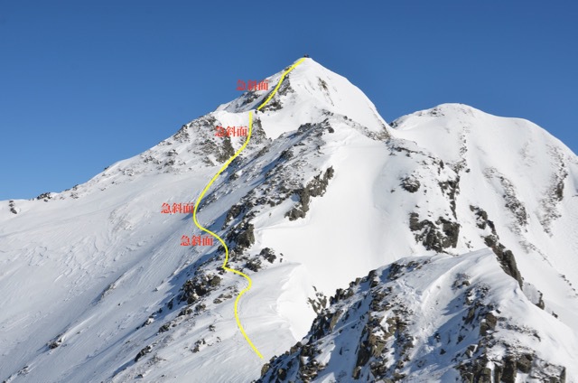 第3峰から山頂までのルートは上の写真のようになります。このうち下の方に記載した二つの急斜面の部分が高度感のあるトラバースになります。上の二つの急斜面と記載の部分は例のごとく雪質により難易度が全く異なる部分です。
