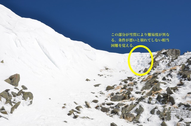 クサリのある岩を左に切り返した後の最後の直登部分が一番困難な場所です。アイゼンとピッケルをフル活用して3点確保で登ります(雪の状態がよく技術がある人は普通に上り下りできますが)。ただしこの部分の雪が締まっていない場合は非常に困難になります。登るときはまだ良いのですが降りるときは死ぬような思いをすることになります。この部分で滑落したら命の保証はありません。凍結している場合も同様です。