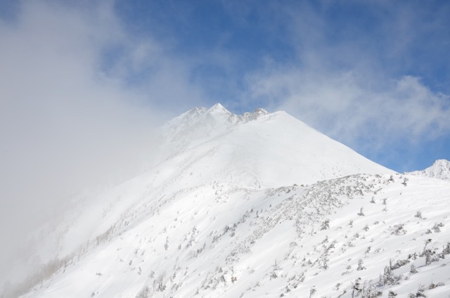 上の写真は独標手前の第12峰です。こちらは登ってくるときはあまり峰という意識がないのですが、下山するとき見ると「え、こんなところ来たっけ?」とびっくりすることが多いです。この第12峰は夏と積雪期ではルートが違うので夏に来たことがある方は注意が必要です。夏はこの峰を巻いていくのですが積雪期は峰の上を越えて行きます。下山する際は夏道にマーキングがされているので誤ってトレースのない夏道に入り込んでしまう可能性が高いので注意が必要です。